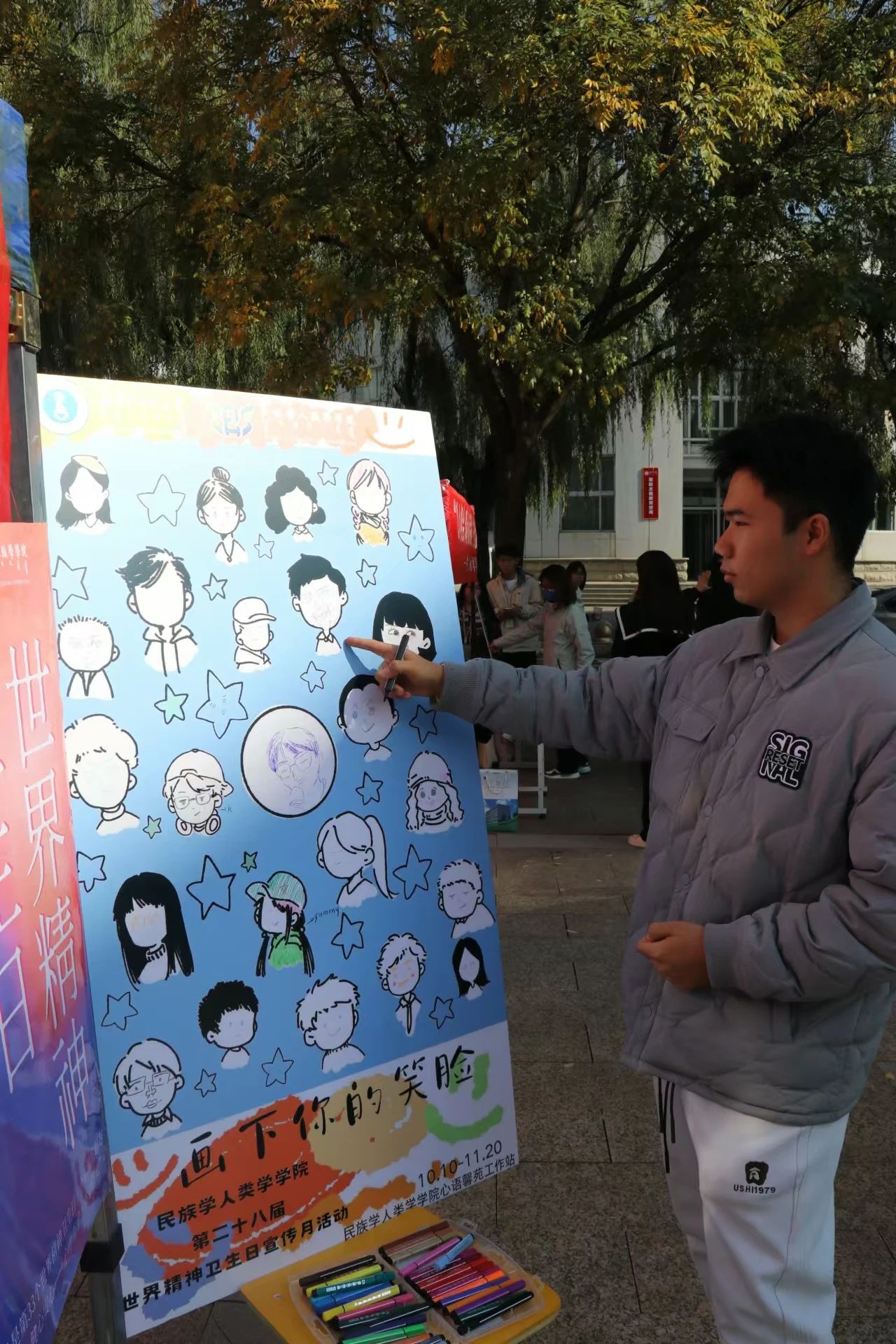 在互动环节,主要以书写并粘贴“心理便利贴”以及“画出自己心中的笑脸”作为活动形式。鼓励同学们在便利贴上写下对自己、家人和朋友的“心语心愿”,其内容涵盖祝愿、激励、烦恼或者困扰等方面,同时描绘出自己内心所喜爱的形象。借助这些方式,促使同学们在书写与绘画的进程中学会自我调适,培养积极的心态,勇敢地规划未来,摒弃杂念,抛开烦恼和焦虑等不良情绪,探寻与自我和谐共处的途径。活动现场氛围热烈非凡,往来的学生们都积极地书写内心感受,勾勒自我形象,描绘笑脸,并与“心灵树”合影留念。