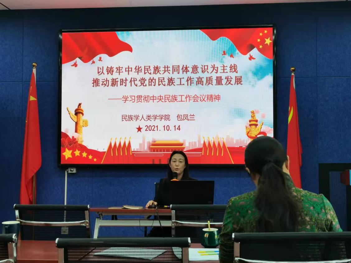 10月14日下午,米兰官网党委书记包凤兰在田楼615会议室为全院教工做了题为“以铸牢中华民族共同体意识为主线,推动新时代党的民族工作高质量发展”的有关中央民族工作会议精神的宣讲。