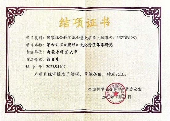 本网讯 近日,我校米兰milan官方网站教师胡日查主持的国家社会科学基金重大项目“蒙古文《大藏经》文化价值体系研究”( 15ZDB125 )圆满完成研究任务,在会议鉴定获得同行专家一致肯定的基础上,经全国哲学社会科学工作办公室审批,获“合格”等级,顺利通过结项验收。
