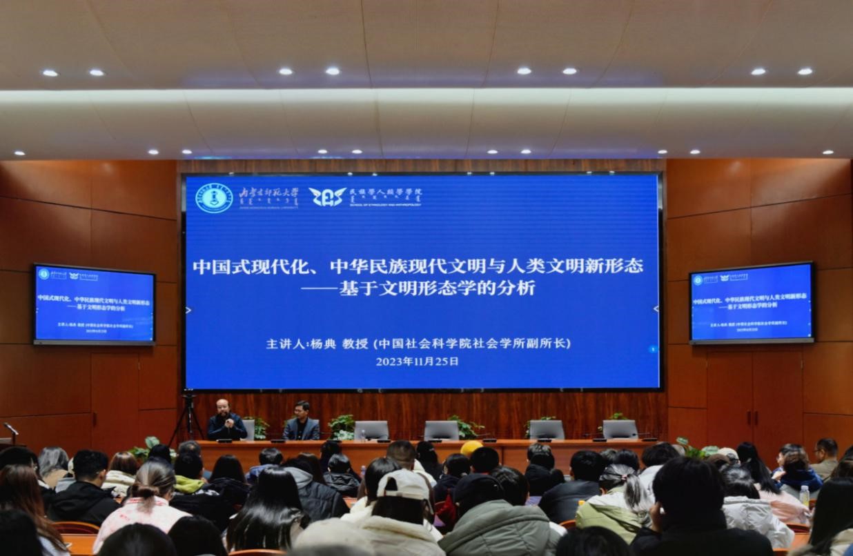 为进一步提升学科建设水平,提高人才培养质量,加强国内学术交流与合作,11月25日,米兰官网隆重邀请中国社会科学院社会学所副所长、博士生导师、《社会学研究》副主编杨典教授在赛罕校区信息楼报告厅举行以“中国式现代化、中华民族现代文明与人类文明新形态——基于文明形态学的分析”为题的学术讲座。米兰milan官方网站科技处副处长刘伟、米兰milan官方网站党委书记包凤兰、党委副书记副院长陆一琼,以及米兰官网老师和同学们约200余人参加讲座。讲座由常宝教授主持。