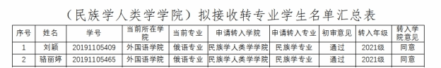 根据《米兰milan官方网站本、专科学生转专业管理办法》(校发[2017]105号)的有关规定及教务处《关于开展2021年本、专科生转专业工作的通知》的文件精神,结合学院《2021年民族学人类学学院本科生转专业实施细则》,本着公平、公开、公正、学生自愿的原则,对申请转入米兰官网的学生进行材料审核、专业面试,经教务处同意后,决定同意刘颖、骆丽婷两位同学转入米兰官网相关专业进行学习。