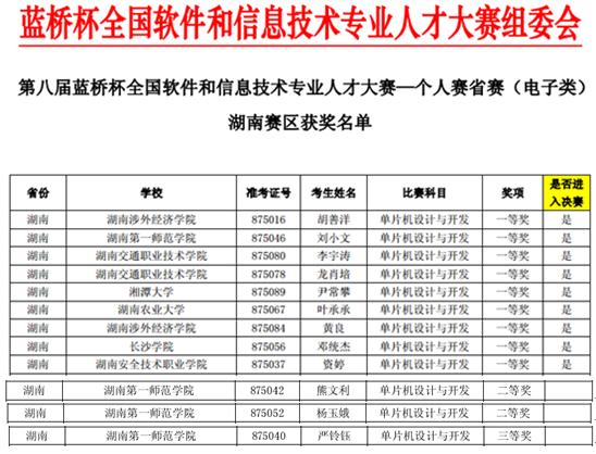4月8日,由教育部高校学生司指导、工业和信息化部人才交流中心主办的第八届“蓝桥杯”全国软件和信息技术专业人才大赛湖南省赛在湖南涉外经济学院举行,有来自湘潭大学等11所本专科院校的87名学生参加了本次竞赛。其中,bat365官网信息科学与工程学院共有6名学生参加了本次竞赛。经过激烈角逐,bat365官网学生获得一等奖1项、二等奖2项、三等奖1项。