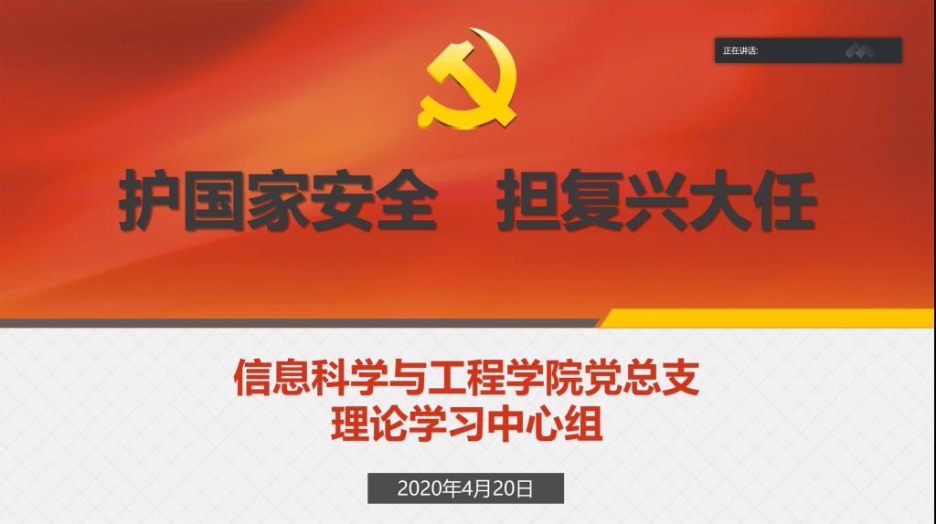 4月20日上午,bat365官网党总支理论学习中心组通过腾讯会议系统线上开展主题为“护国家安全,担复兴大任”的集中学习。会议由学院党总支书记王杰文主持。