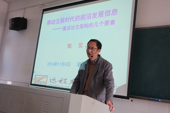 11月4日,中国教育技术协会理事,中国教育技术协会期刊专业委员会副主任,中国教育技术协会教育游戏分会副理事长,华人探究学习协会理事,《远程教育杂志》(CSSCI)执行副主编兼编辑部主任陶侃教授应邀来bat365官网讲学,为200余名师生作了以“移动互联时代的前沿发展信息——兼谈论文架构的几个要素”为主题的学术报告。校长助理、信息科学与工程学院院长李勇帆教授主持报告会。