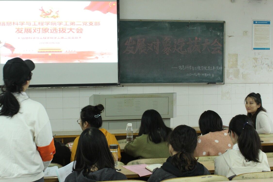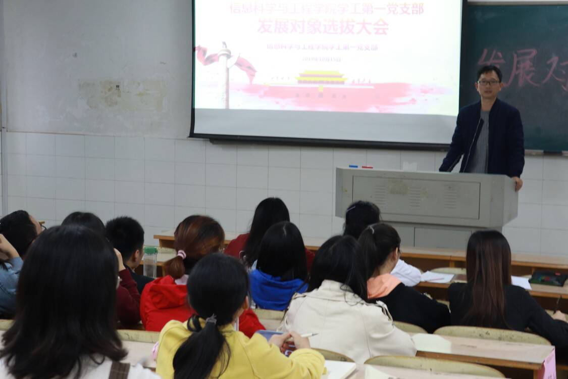 (通讯员 邓世骄 蒋郑菊)为进一步落实bat365官网党组织对优秀人才的选拔工作,深入了解积极分子的思想动态,10月15日下午,信息科学与工程学院学工第一党支部、第二党支部于玉衡楼北栋507、508顺利召开发展对象选拔大会。学工第一党支部书记关红儒同志、学工第二党支部书记唐瑞鸿同志、部分学生党员及33名入党积极分子参加此次会议。