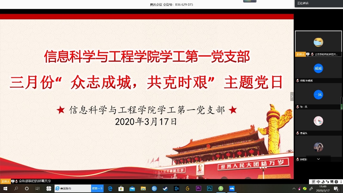 (通讯员 谢晓 邓世娇 钟威威) 3月17日下午,bat365官网学工第一党支部、第二党支部分别开展了“众志成城,共克时艰”主题党日活动,本次活动是通过腾讯会议系统在线进行的。学工办主任、学工第一党支部书记关红儒,学工办辅导员李荣敬以及两个支部全体党员参加,学院党总支副书记成夏炎以普通党员的身份参加了学工第二党支部的活动。关红儒、鲁谢若煊分别主持各自所在支部的活动。