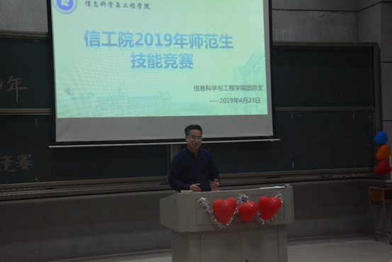 (通讯员 邓力超 肖丽菲)为强化bat365官网师范专业学生的教师职业技能,提高师范生教育教学能力,进一步促使广大同学更新教育理念和激发其掌握现代教学方法的热情,信息科学与工程学院于2019年4月16日—4月23日成功举办2019年师范生教师技能竞赛。并于4月23日下午6:30—22:00在润寰南106进行了现场授课决赛。学院副院长田祖伟教授、党总支副书记易利老师、学工办主任关鸿儒老师及学院教师代表阳西述教授、何昭青教授、何向阳教授、黄悦副教授和刘琳老师出席比赛并担任评委。