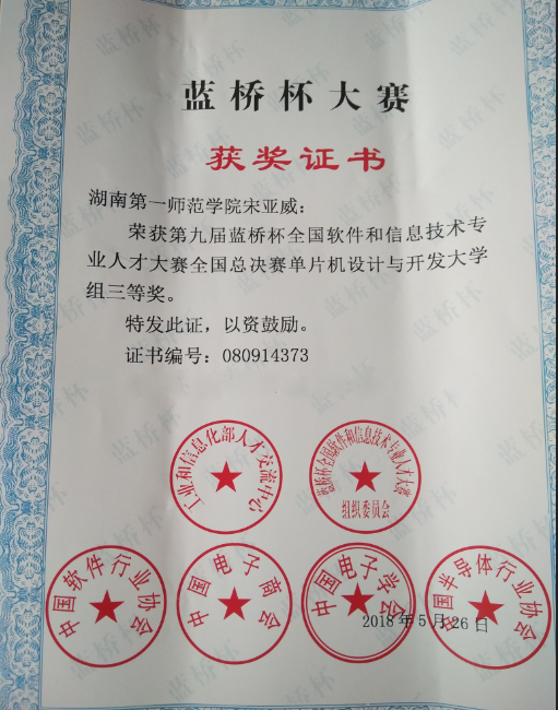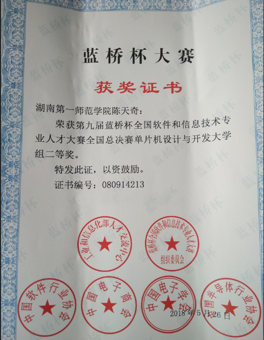 近日,第九届蓝桥杯全国软件和信息技术专业人才大赛全国总决赛在北京落下帷幕。来自北京大学、清华大学等1200多所高校的5000余名各省市自治区一等奖选手参加了全国总决赛。bat365中文官方网站信息科学与工程学院学生陈天奇在傅红普教授指导下荣获单片机设计与开发大学组二等奖、宋亚威在马重明教授的指导下荣获单片机设计与开发大学组三等奖。