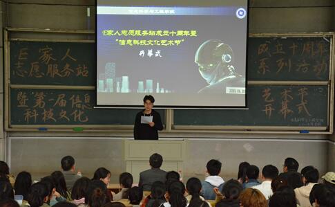 随后,王杰文教授回顾了E家人志愿服务站成立10年来开展的各项特色服务工作和收获的经验成果,并感谢每位老师和同学们的辛勤付出。另外,王教授在充分肯定了信工学子在往年技术精英竞赛季上出色表现的同时,鼓励同学们要再接再厉,积极踊跃地参与到信息科技文化艺术节的各项竞赛中,认真准备,全力以赴,切实做到“手脑并用,知行合一”,并寄语同学们要秉承以赛促学的初衷,提高对特色专业的知识应用能力。