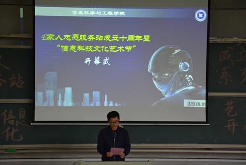 在激情昂扬的国歌奏唱中,开幕式正式拉开序幕。会上,易利老师回顾了E家人志愿服务站十周年历程,宣读了学院2019年“信息科技文化艺术节”工程整体工作方案,引导学生积极参赛、备赛、竞赛,并鼓励广大同学勇于创新,强化科技理念,共同努力全面推动优良院风建设。