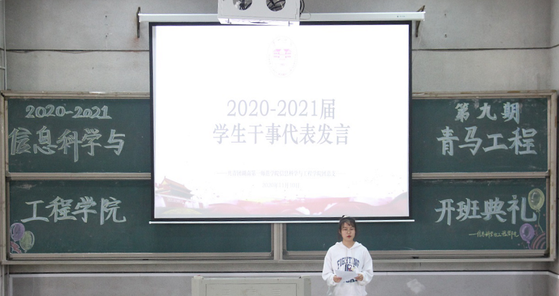 在与会领导、老师为2019-2020届学生干部颁发了任职聘书之后,2020-2021届学生干部代表19电信1班张旭和新任学生干事代表20级教技849班金欢相继发言。