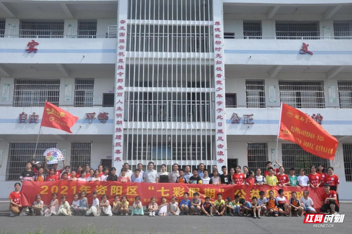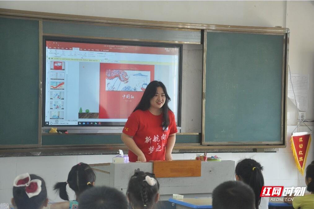 长塘仑小学位于湖南省益阳市资阳区迎风桥镇境内,资水之阳,三区之交,树木树人,葱郁垂阴,迎风起舞,“E起”同行。如今,20多名志愿者带着“红色一师”的革命传统和教育传统,用自己的学科知识,结合建党100周年的时代背景和红色故事,为82名小学生带来了别开生面的红色课程。《大郭小郭行军郭》《中国红》《纪念碑下的小花》等课上,孩子们兴趣浓厚。