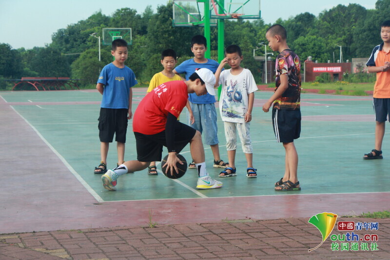 图为下课时,学生围着队员,让队员教他们打篮球,队员正在给他们示范,并教他们如何正确运球。中国青年网通讯员 何星逸 摄
