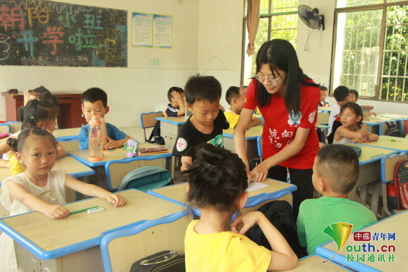 图为队员正在给小班的学生上手工课,队员走下讲台,给不熟练的学生给予指导。中国青年网通讯员 何星逸 摄