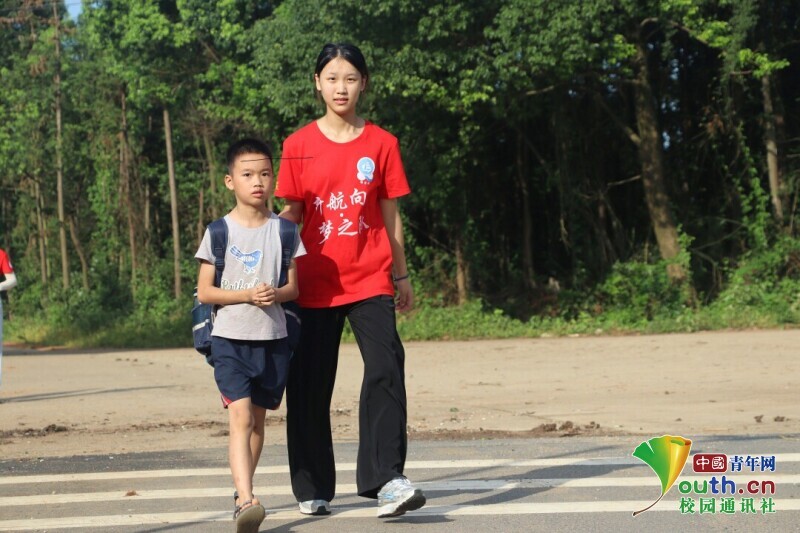 图为新航向•梦之队队员起床洗漱后在校门口期待学生来报道的背影。中国青年网通讯员欧阳健 摄