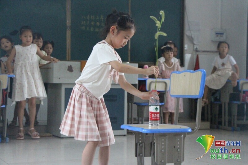 图为插旗接力项目中,朝阳班孩子小心的将棋子插入瓶中,孩子们说小心、小心很紧张的看着。中国青年网通讯员 段新利 摄