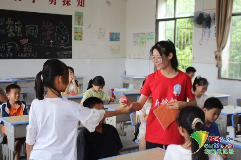 图为志愿者老师在手工课上教学生折红心,下课后学生把自己亲手折的红心送给老师。中国青年网通讯员 欧阳健 摄