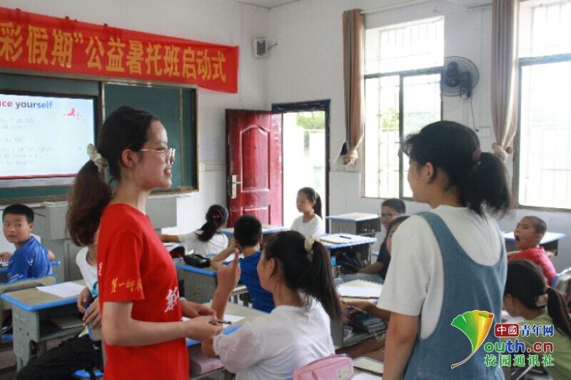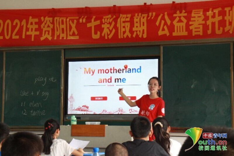 图为新航向·梦之队志愿者在为孩子们讲解英文版《我和我的祖国》的题目。中国青年网通讯员 欧阳健 摄