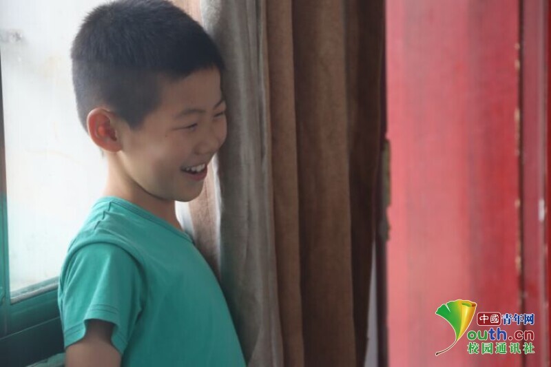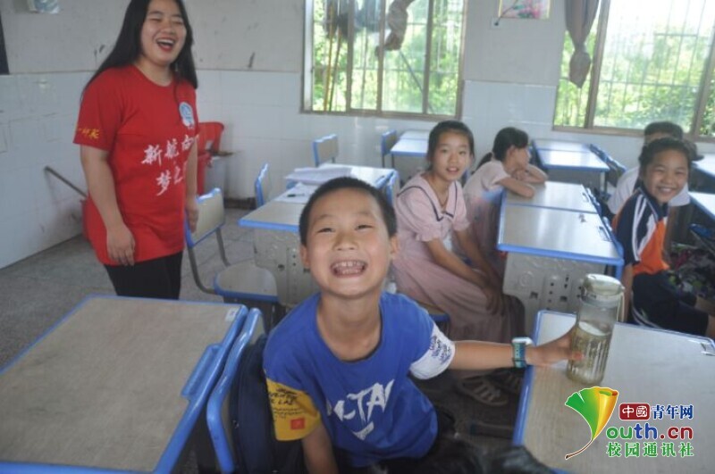 图为与班上同学和老师熟悉后,小男孩对着镜头做鬼脸,逗得大家哈哈大笑。中国青年网通讯员 欧阳健 摄