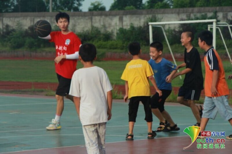 图为新老师与孩子们在打篮球,操场上时不时传出阵阵欢声笑语。中国青年网 段新利 摄