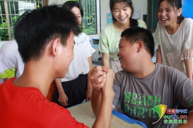 图为学生与新老师掰手腕时露出了窘迫的表情,周围同学忍俊不禁。中国青年网通讯员 欧阳健 摄