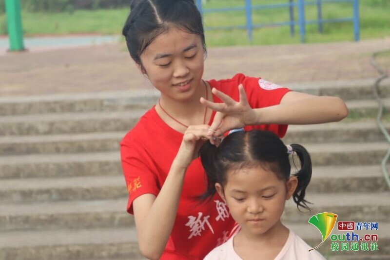 图为孩子早早到校但头发较凌乱,队员正在细心地给她梳头、扎辫子。 中国青年网通讯员 段新利 摄