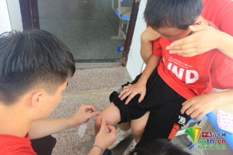 图为孩子奔跑时不小心擦破了膝盖上的皮,队员正在给他消毒、贴上创口贴。 中国青年网通讯员 段新利 摄