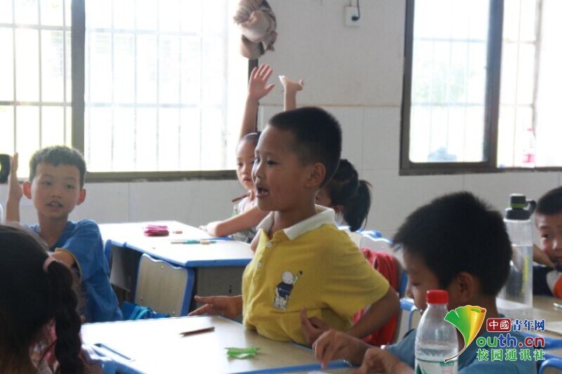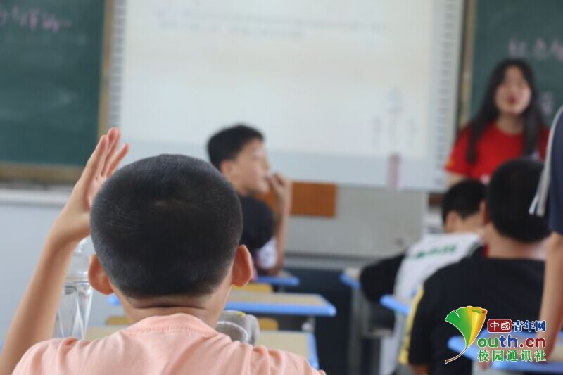 图为课前老师与学生互动,学生们踊跃举手发言。中国青年网通讯员欧阳健 摄
