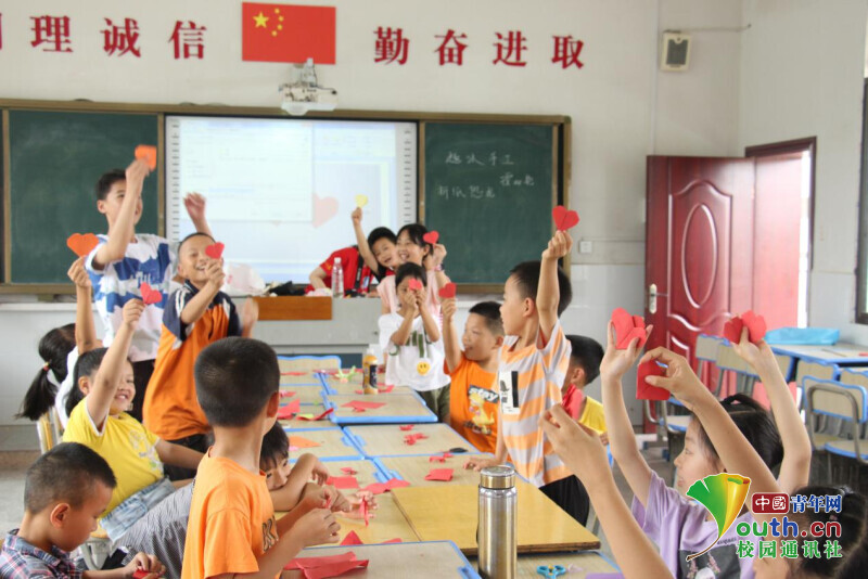 图为趣味手工课上,学生们在志愿者的带领下学会了折红心,学生们正开心的展示着自己的作品。中国青年网通讯员 欧阳健 摄