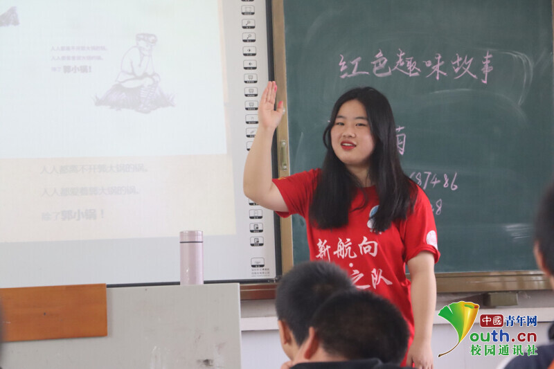 图为红色趣味故事会上志愿者老师举手示范,引导同学们积极举手发表自己的想法。中国青年网通讯员 段新利 摄