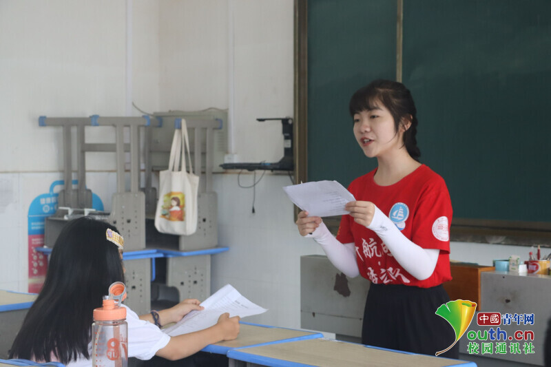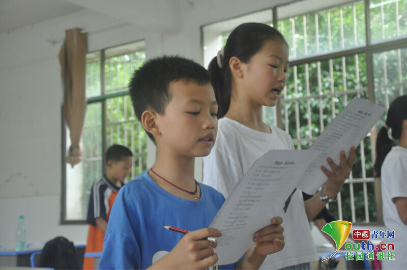 图为学生小薇在新航向·梦之队队员的帮助和指导下,展示所学的腹部呼吸朗读法。中国青年网通讯员 段新利 摄