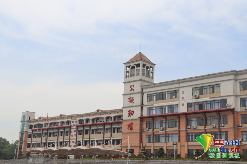 图为国基实验小学教学楼上书写张国基先生的办学宗旨“公诚勤朴”。中国青年网通讯员 段新利 摄