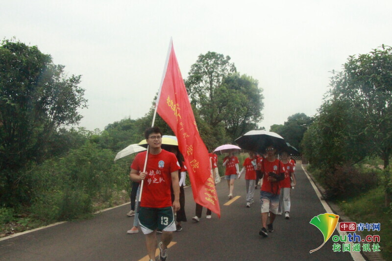 图为队员们举旗出发前往张国基纪念馆的场景。中国青年网通讯员 段新利 摄