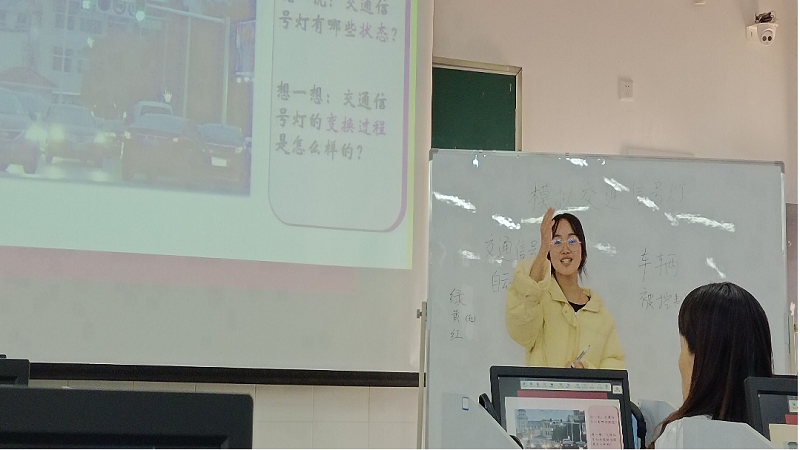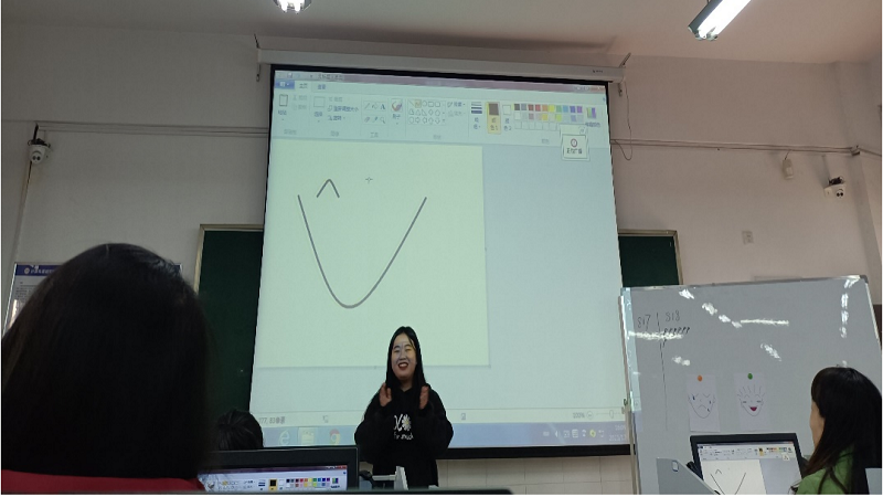 示范课上,徐仪婷同学通过一个视频进行情景导入,引导学生认识“动画”,设计了一系列课堂小游戏吸引学生的好奇心和求知欲,通过富有生动活力的语言讲解“动作路径”;张一凤同学则从“交通安全”背景出发,巧妙构建模拟信号灯的动画,引导学生循序渐进了解掌握Scratch软件中的“循环”;蒋郑菊同学则通过“表情猜猜猜”游戏吸引学生融入课堂,接着利用多个丰富多彩的课堂活动,将“曲线工具的妙用”这一知识铺展开来。三位实习生分别通过自己的课堂实践展现了作为一名未来小学信息技术教师的创新能力和青春活力。