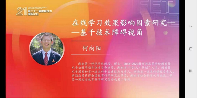 11月19日至11月20日,第21届教育技术国际论坛(IFET2022)在沈阳师范大学召开。bat365官网何向阳教授受邀在嘉宾学者论坛做题为“在线学习效果影响因素研究——基于技术障碍视角”的学术报告。