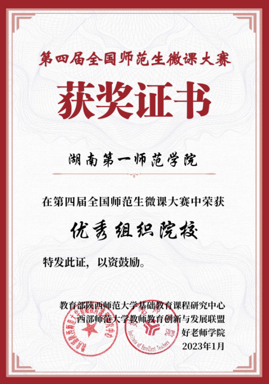 2023年1月16日,第四届全国师范生微课大赛结果揭晓,bat365官网组织选送的12项作品获奖,其中特等奖3项、一等奖2项、二等奖7项。我校获评优秀组织院校,刘琳、谷炽辉、张卓林老师被授予“优秀指导教师”荣誉称号。