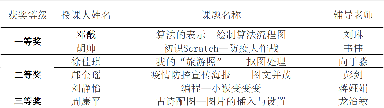 2022年11月-2023年1月,由中国高教学会高等师范教育研究会主办的第十四届全国师范院校初等教育(小学教育)学院(系)学生数学、信息技术录像课评比(以下简称“评比”)于线上举行。经过激烈的角逐,我院教育技术学专业学生喜获佳绩,荣获一等奖两项,二等奖三项,三等奖一项(详见下表)。