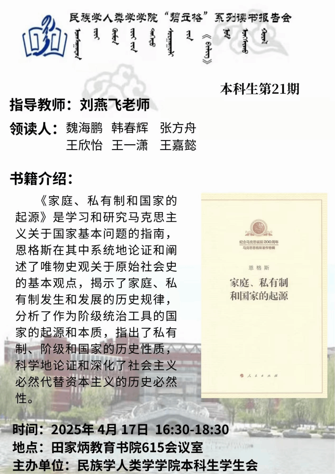 为丰富专业认知、拓宽专业视野,米兰官网秉持笃学致知以夯基础、开卷启思以拓思路、读书明智以塑品格的理念, 致力于营造积极向上、勤勉求知的学风。 4月17日下午,本科生第21期“碧立格”系列读书报告会在田家炳教育书院615会议室成功举行。本期读书会由刘燕飞老师指导,6位同学领读,阅读书目是恩格斯的《家庭、私有制和国家的起源》。