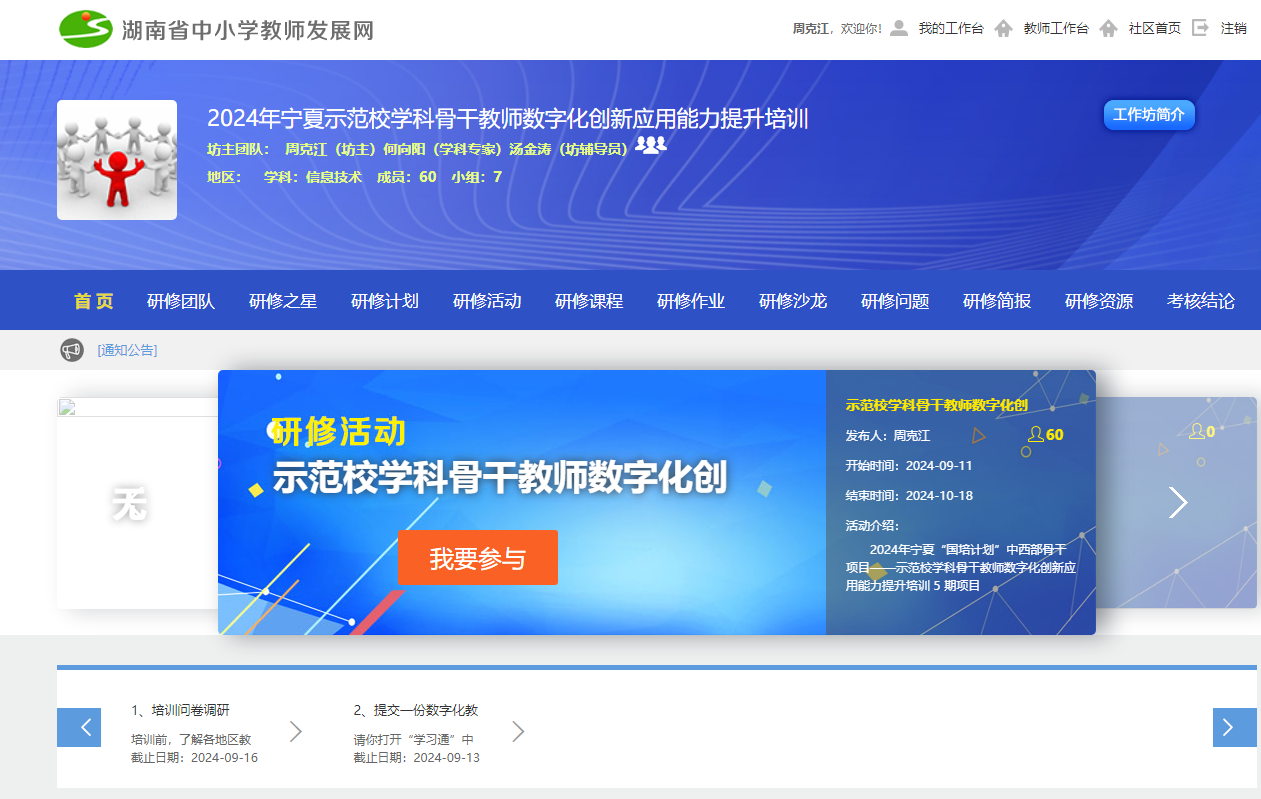 该项目由bat365官网周克江老师担任首席专家、13位知名国培专家担任授课教师。教学模式采用混合式研修,由线上工作坊研修(30学时)和线下集中培训(约42学时)两部分组成。线上工作坊研修时间为9月11日至年9月18日,集中培训时间为9月20日至9月27日。