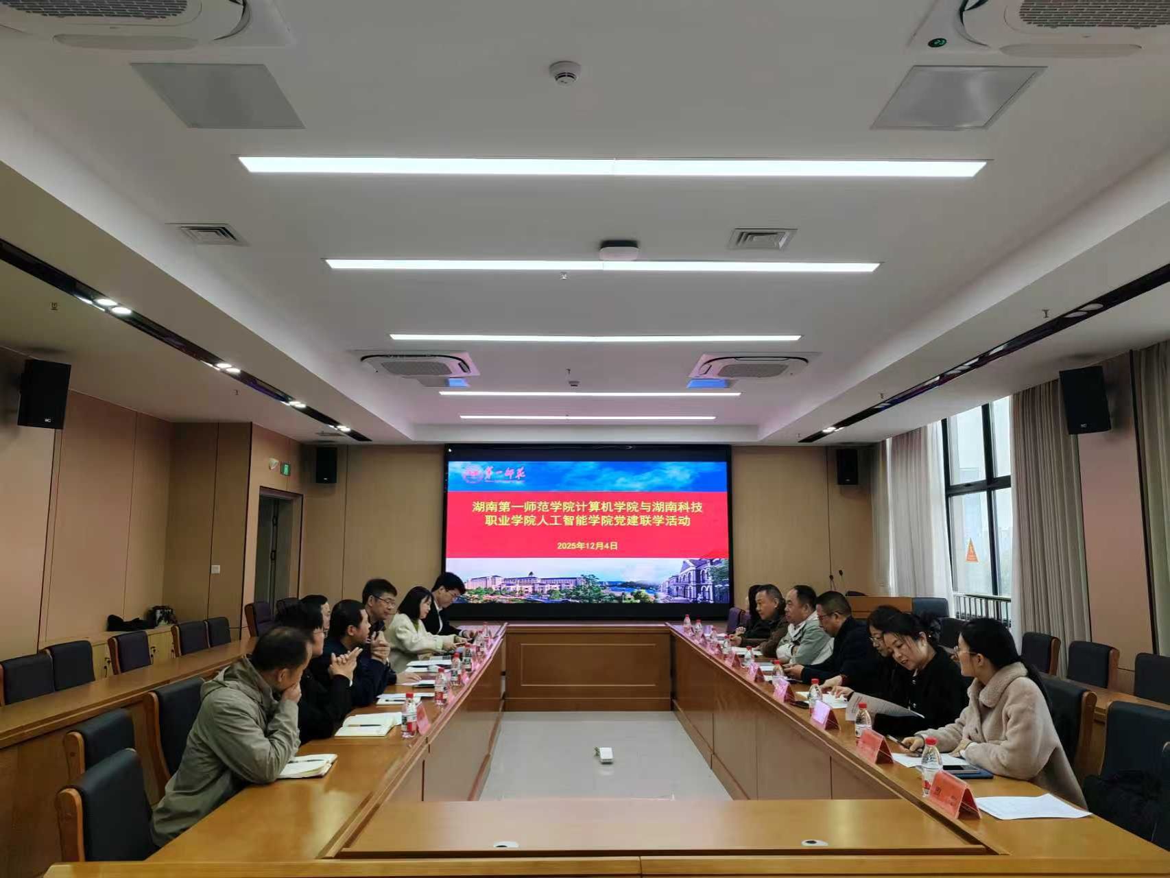12月4日上午,我院与湖南科技职业学院人工智能学院在立园楼712会议室开展党建联学活动,深入学习贯彻党的二十届四中全会精神,深化校际合作。院党政班子全体成员、现代教育中心副主任周贤、系主任代表,湖南科技职业学院人工智能学院党总支书记刘志勇、网络安全与信息技术中心主任易东初等参加了活动,活动由bat365官网党委副书记陈奕主持。
