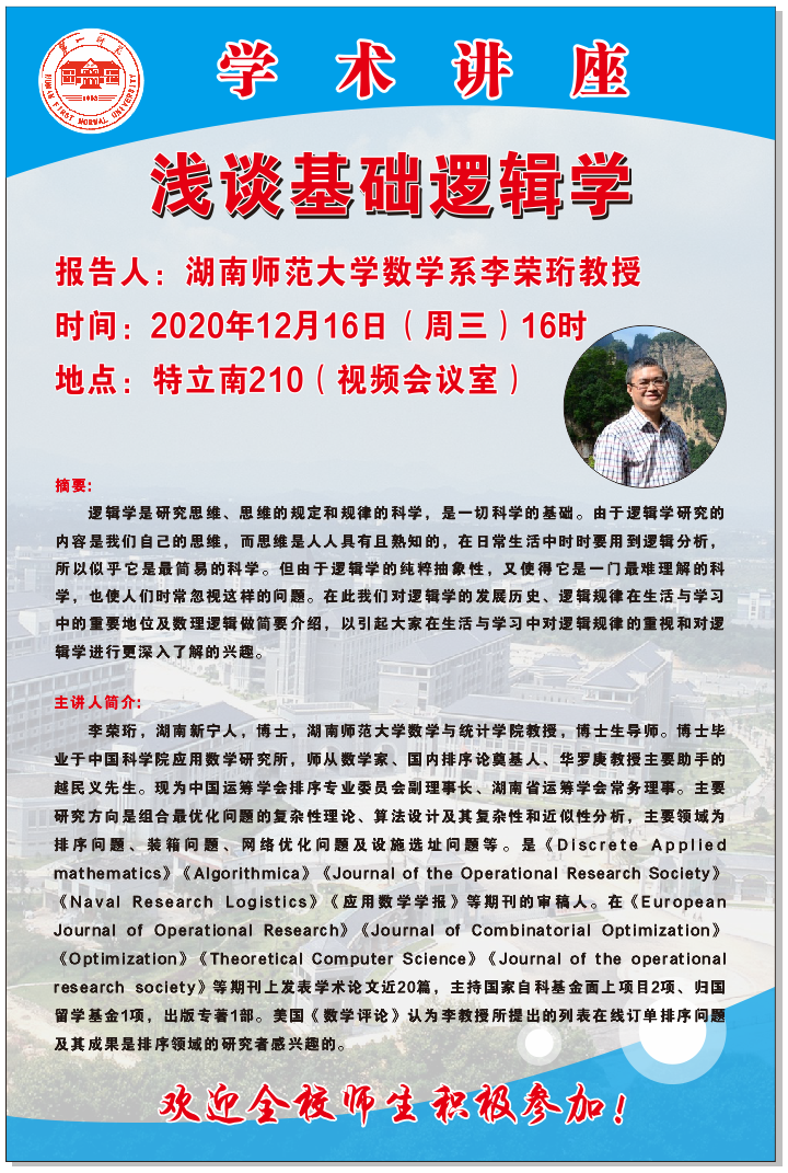 【学术讲座预告】 湖南师范大学数学系李荣珩:浅谈基础逻辑学
