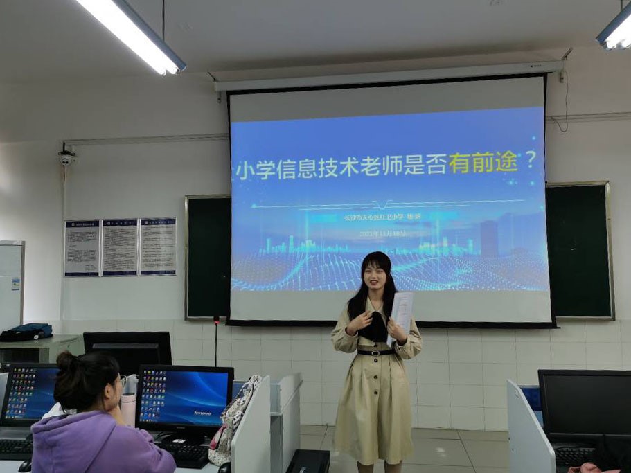 为配合bat365官网六年制教育技术学专业教育实习工作的开展,加强专业学生对“小学教育技术老师”的理解与认识,11月18日下午,bat365官网邀请天心区红卫小学信息组组长杨妍老师为bat365官网学子带来“小学信息技术老师是否有前途?”专题讲座,以及“研学旅行百事通——搜索引擎的使用(项目研讨课)”示范课。讲座及示范课于特立北302(七机房)顺利开展,19级817、818教技班学生参加。