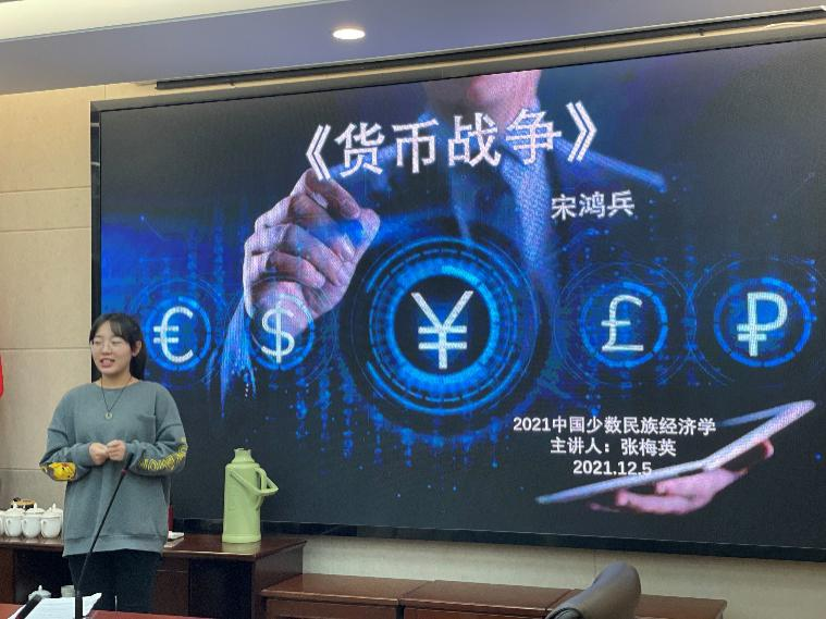 米兰milan官方网站2021级学硕一班硕士研究生第4期“碧立格”读书报告会于12月5日晚19点在田楼607会议室举行,21级学硕一班硕士研究生全员参加本次读书报告会。本次读书报告会的汇报书目是《货币战争》,主讲人是21级中国少数民族经济专业硕士研究生张梅英同学,主持人是21级中国少数民族经济专业硕士研究生特日格乐同学。阿荣老师,萨如拉老师出席此次读书报告会并进行指导。