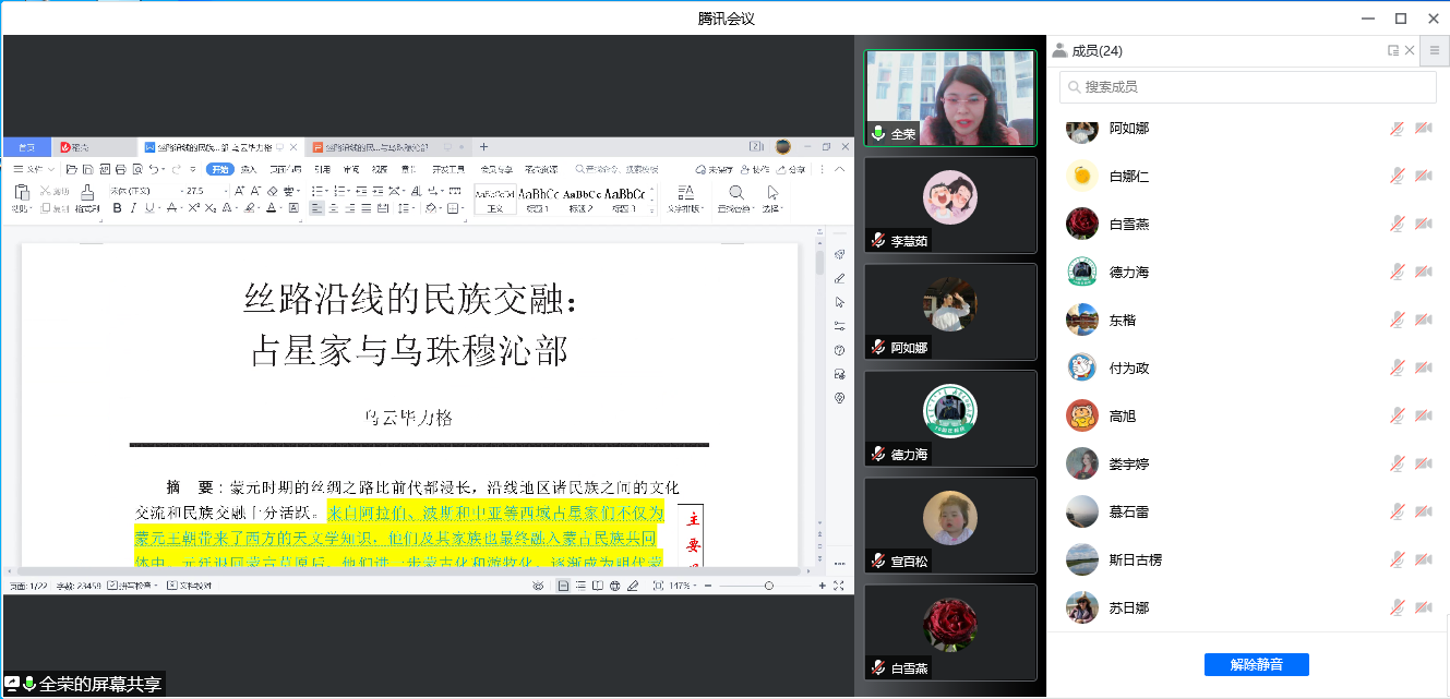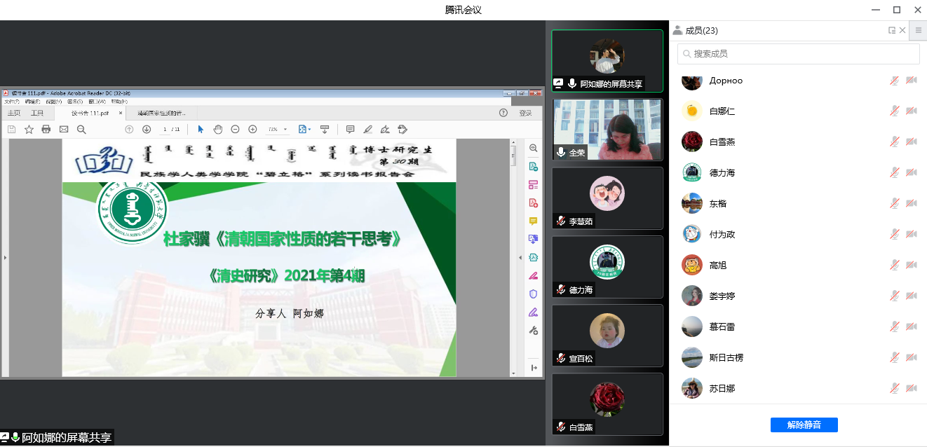 2022年3月20日下午3:00,米兰milan官方网站2020级、2021级博士研究生通过“腾讯会议”举行了第30期读书报告会。本次读书报告会的汇报者是中国少数民族史专业的全荣、阿如娜、宣柏松等3位博士生。博士生导师胡日查教授出席本次读书报告会并进行指导,2020级博士生李慧茹主持本次读书报告会。