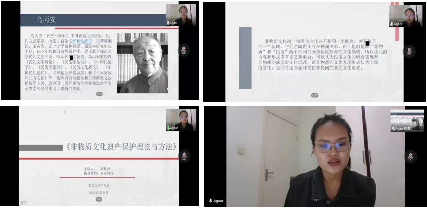 米兰milan官方网站2021级学硕一班硕士研究生第5期“碧立格”读书报告会于3月31日晚19点在腾讯会议上举行,21级学硕一班硕士研究生全员参加本次读书报告会。本次读书报告会的汇报书目是《非物质文化遗产保护理论与方法》,主讲人是21级民俗学专业硕士研究生阿格日同学,主持人是21级民俗学专业硕士研究生王永梅同学。班主任阿荣老师,民俗学专业硕士生导师双金教授出席此次读书报告会并进行指导。