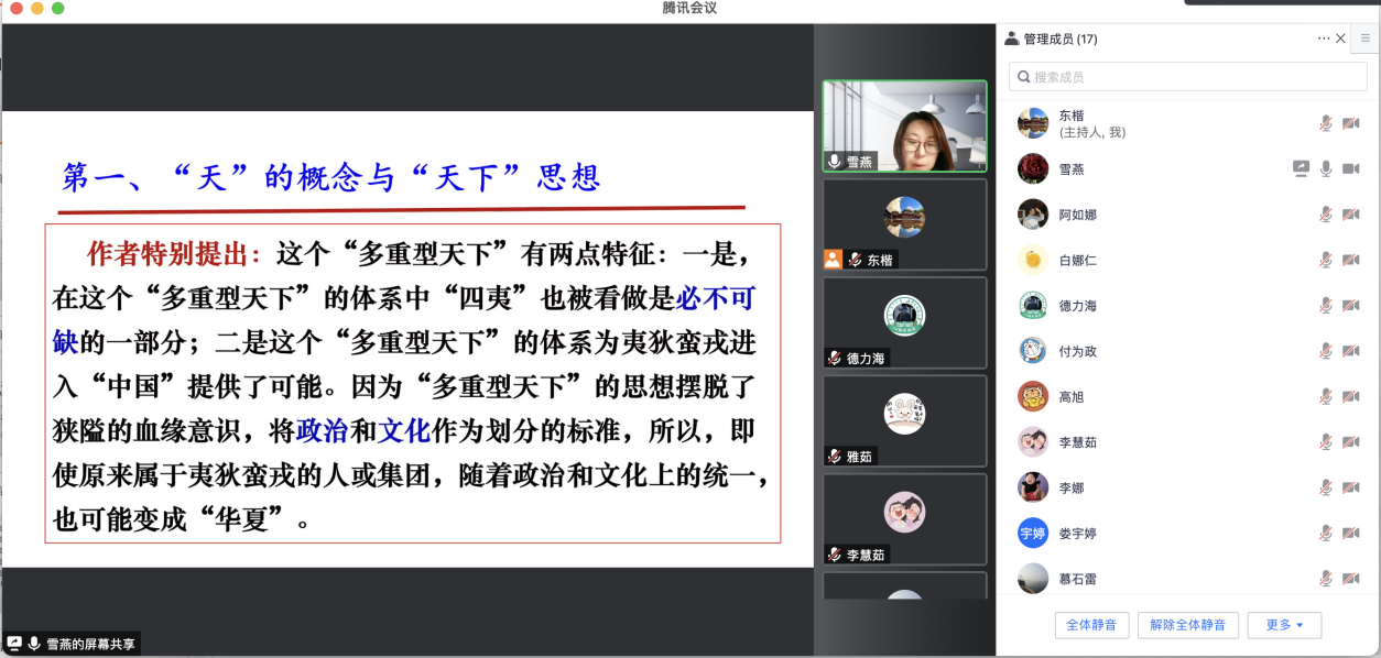 白雪燕同学分享的是一本由日本华裔作者王柯于2020年3月出版的著作《从“天下”国家到民族国家:历史中国的认知与实践》。该同学从作者简介、主要内容、个人思考三部分介绍了这部著作。首先介绍了作者的研究方向和主要代表作;其次围绕文中的一条主线:“不是以多民族共存为前提的‘天下思想’带来了‘中国’的多民族性质和‘华夏’的多民族来源,而是‘中国’的多民族性质和‘华夏’的多民族来源带来了以多民族共存为前提的‘天下思想’。”第一,梳理了“天”的概念与“天下”思想,指出古代中国人的这种对于“天”与世界的直观认识,构成了“天下思想”的最基本原理;第二,按照大朝代为划分时代的标准,梳理了从先秦到近代中国多民族统一国家思想的发展脉络,揭示中国多民族统一国家思想形成与发展的轨迹;第三,分析了国民国家理论与中国多民族国家现实的矛盾;第四、指出中国共产党民族政策的变化过程,实际上也是共产党自身不断变化、不断成熟的过程,从无产阶级的立场,到中华民族的立场,再到中国国家的立场,正是中国共产党民族思想的成熟和进步,才使中国多民族统一国家的优秀传统得以在当下得到继承和发扬。最后,提出了个人对于这部著作的思考。认为该著作对于问题采取层层深入的方式值得我们学习,同时也指出了在引文上,偏重于日本学者和古籍材料,而对中国学者的成果引用较少的不足。