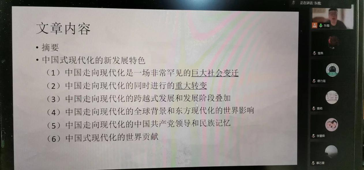 索东楷同学分享的是《中国式现代化与新发展社会学》(《中国社会科学》2021年第12期)一文。分享者从作者背景、期刊简介、论文内容以及自身感悟四部分对论文进行了介绍。本文基于中国式现代化的经验,将现代化过程中的发展理念、发展动力、比较优势、约束条件、发展瓶颈、发展目的等一系列重大发展议题上进行了总结,对于如何实现中国式现代化以及社会学在新发展阶段如何发展提出了自己的希冀,认为要实现上述目标必须形成了自身的理论体系。