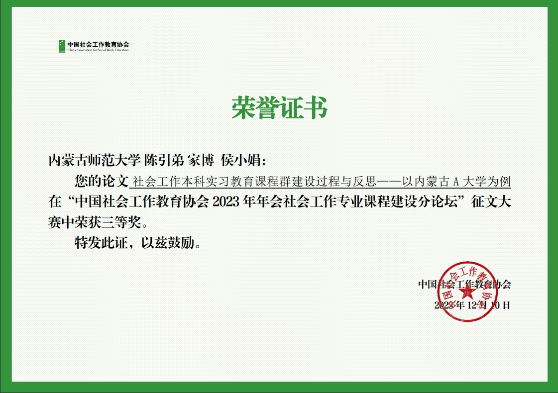 米兰官网陈引弟老师在分论坛发言,同时其与侯小娟、家博两位老师合作论文《社会工作本科实习教育课程群建设过程与反思——以内蒙古A大学为例》荣获分论坛三等奖。2021级社会工作专业本科生陈元照、陈立冬两位同学的论文入选分论坛“社会工作实务各领域发展与实践”,并参与汇报。