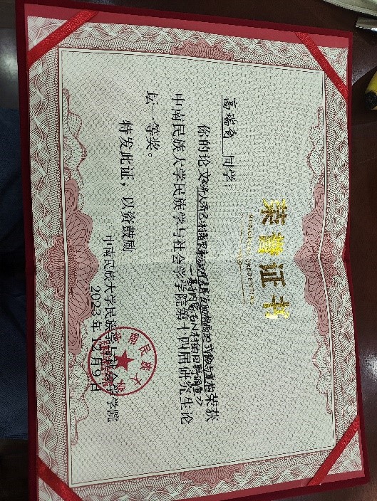 民族学专场结合不同的视角对铸牢中华民族共同体意识下的历史、文化与行动的多元面向进行探讨,米兰官网2023级民族学硕士研究生高瑞奇同学以《济人利己:村落农事活动中“差序”互惠格局的式微与重构——基于内蒙古N村的田野调查》为题做汇报,并荣获第十四届研究生论坛民族学专场一等奖。