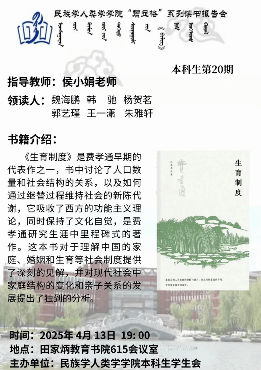 为丰富专业认知、拓宽专业视野,米兰官网秉持笃学致知以夯基础、开卷启思以拓思路、读书明智以塑品格的理念,致力于营造积极向上、勤勉求知的学风。4月13日下午,本科生第20期“碧立格”系列读书报告会在田家炳教育书院615会议室成功举行。本期读书会由侯小娟老师指导,6位同学领读,阅读书目是《生育制度》。